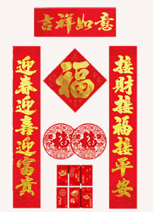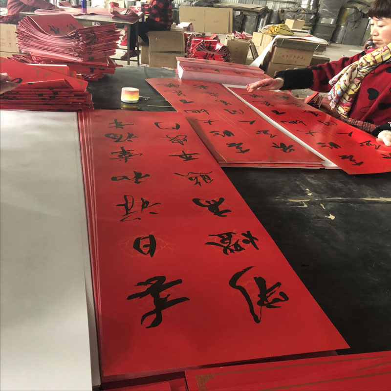 紙對聯(lián)一般指用毛筆在紅紙或其他普通紙上書寫的對聯(lián),書寫效果最為常見。植絨對聯(lián)是用金粉裝飾機器印刷或手寫的對聯(lián),使其更加明亮、閃閃發(fā)光、更加耀眼。