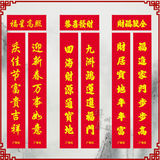 對聯的尺寸根據各地區的張貼習俗確定的,比如山東威海對聯尺寸常用長度:140cm*25cm 橫批:16*50 福字尺寸要求35cm*35cm,如下圖展示